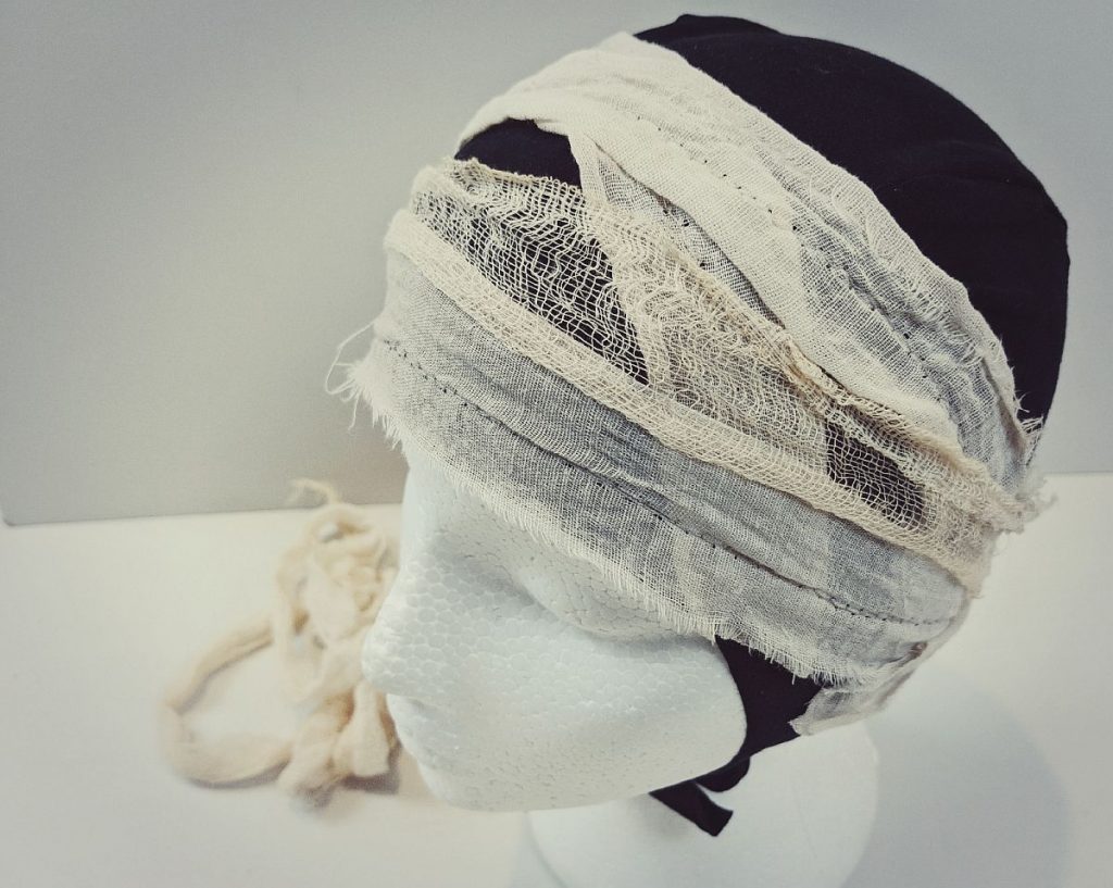 Leave the end bits of the loose-weave cheese cloth dangling a bit to give more of an unravelling mummy effect!